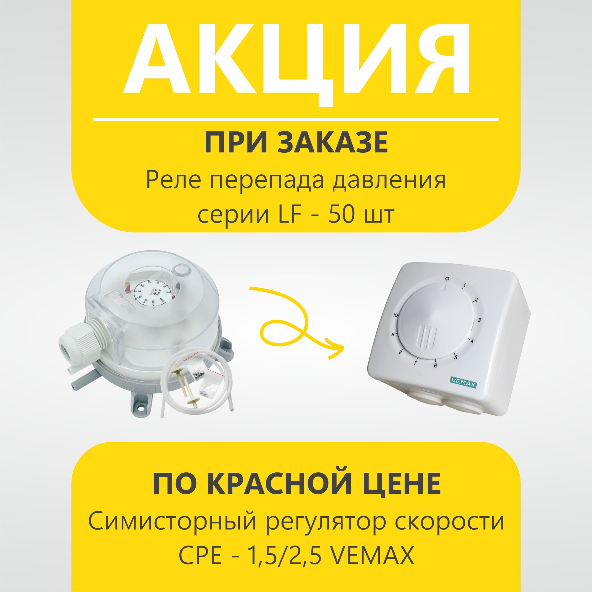 Рады сообщить вам о специальной акции: при заказе реле перепада давления серии LF от 50 штук, симисторные регуляторы скорости СРЕ - 1,5/2,5 предлагаются по 700 рублей, при покупке от 50 шт.