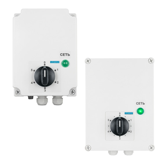 Однофазные пятиступенчатые регуляторы скорости позволяют переключаться между пятью заранее заданными скоростями вращения вручную при помощи поворотной рукояти на корпусе или, у некоторых моделей, автоматически. В последнем случае управление осуществляется через интерфейс Modbus RTU или подачей аналогового 0-10 В управляющего сигнала. Оснащаются LED-индикаторами режима работы, в отдельных моделях реализована функция «день-ночь».